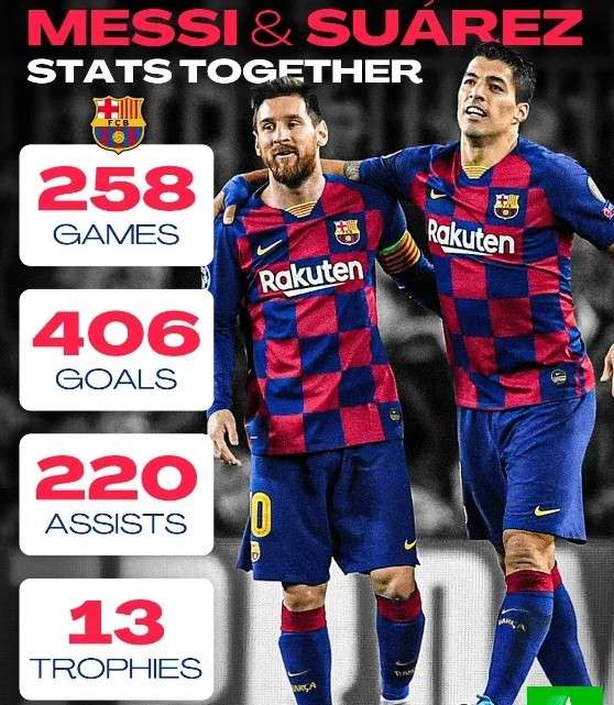 苏亚雷斯&梅西在巴萨共同出战258场比赛 期间共同打入406球送