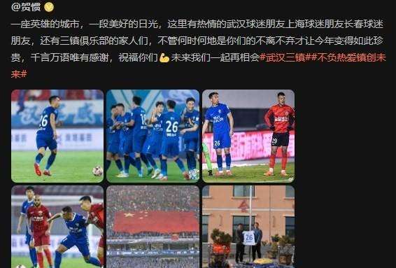 贺惯社媒官宣离队:感谢武汉球迷 千言万语唯有感谢