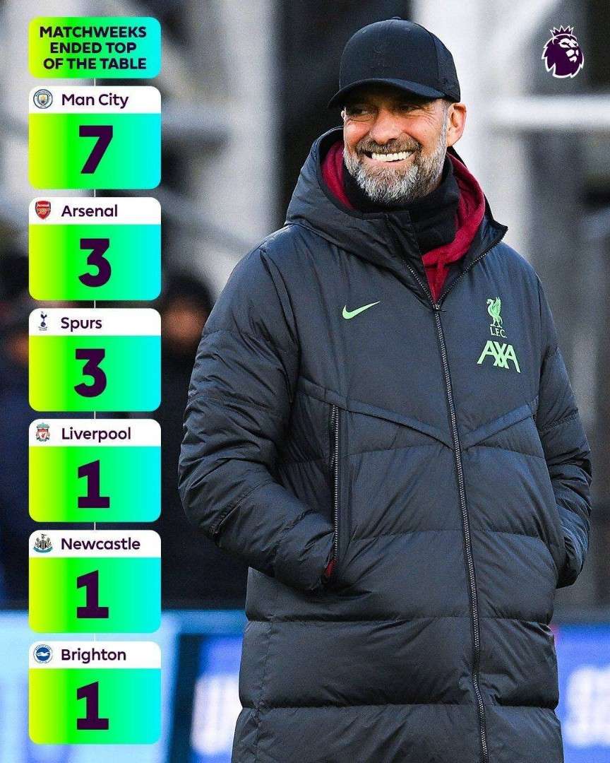 英超榜首更迭数据:曼城7次居首6队上榜 利物浦首度封王双红会后能