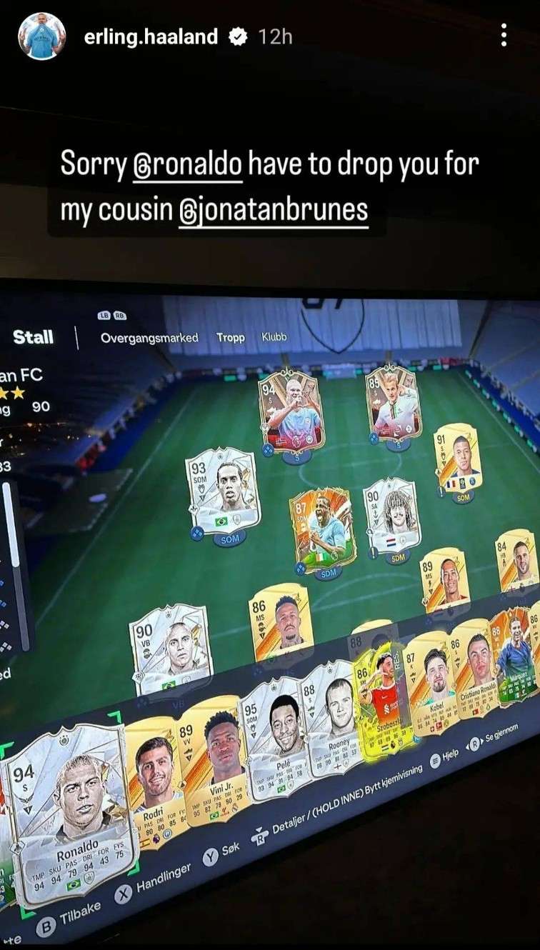 哈兰德道歉!游戏中选择表弟与自己搭档 却让罗纳尔多当替补