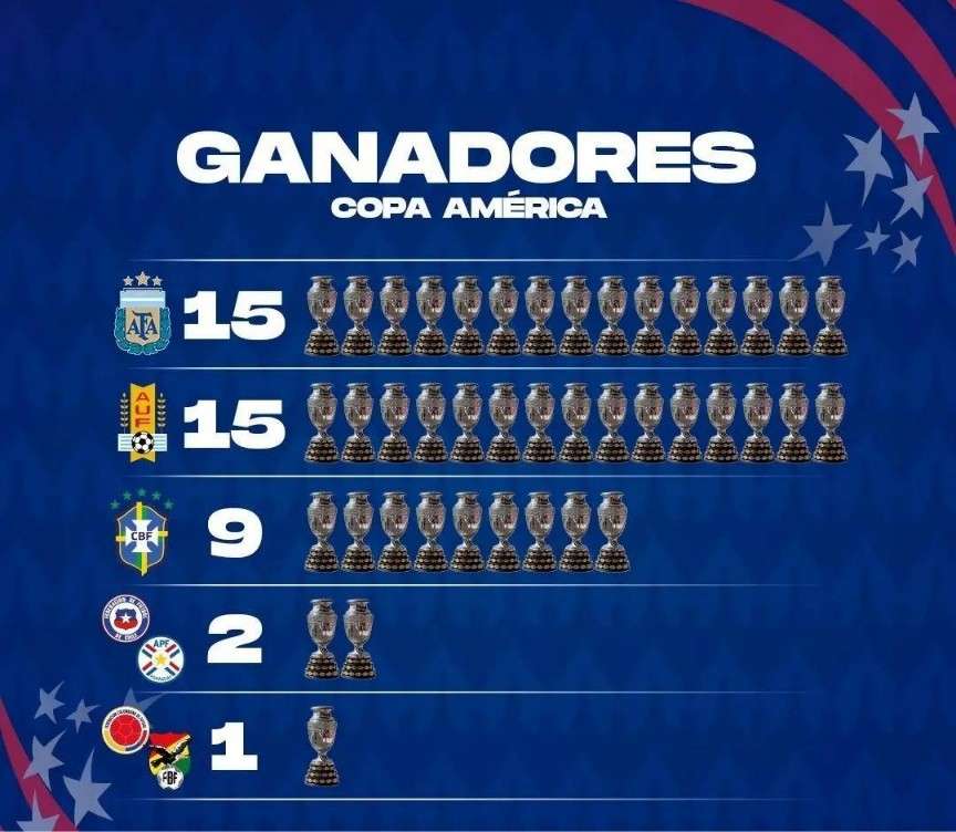 美洲杯夺冠次数:阿根廷、乌拉圭居首 巴西9冠 智利2冠