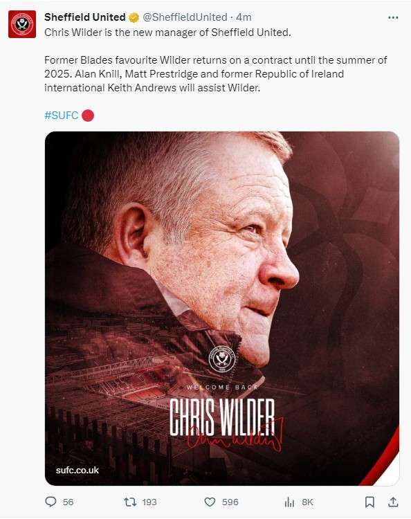 功勋主帅能否挽救垫底球队?官方:怀尔德出任谢菲尔德联新主帅