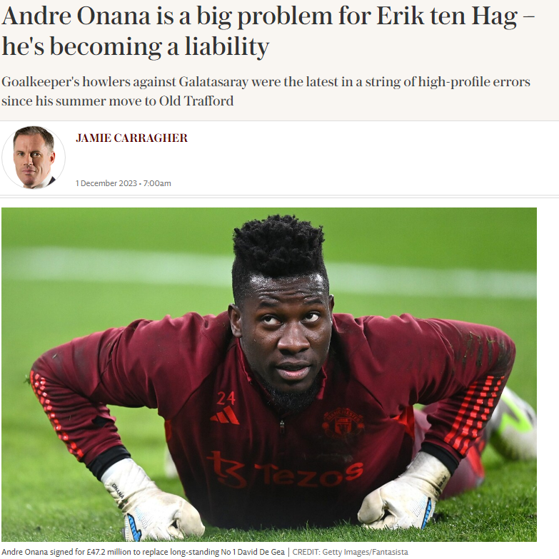 卡拉格:曼联球迷无法忘记德赫亚 奥纳纳已成滕哈赫巨大负担