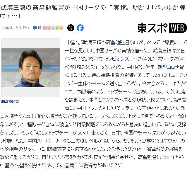 武汉三镇主帅高畠勉:中超经济泡沫破裂 导致参赛球队在亚冠缺乏竞争