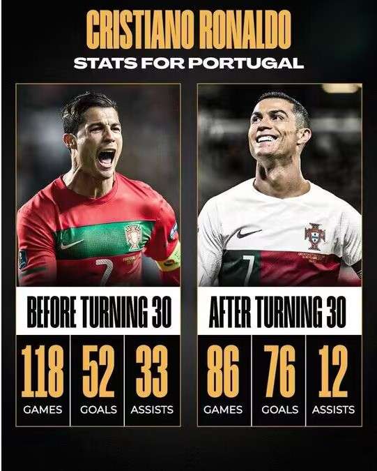 越老越妖!C罗在30岁之前在国家队只进52球 在30岁之后却进了