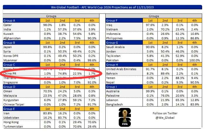 国足仍有1%可能性超韩国夺小组头名 74.8%位列小组第2晋级1