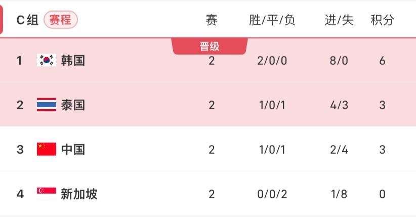 C组排名情况:泰国净胜球优势力压中国排名第二 新加坡0分垫底