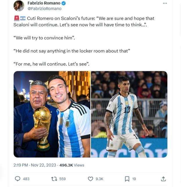 教练你不要走!罗梅罗:我们会努力说服斯卡洛尼留下来 拭目以待吧