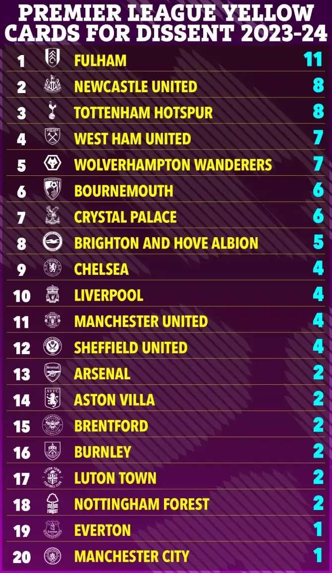 本赛季英超61名球员因抗议判罚染黄:富勒姆11人居首 曼城最少仅