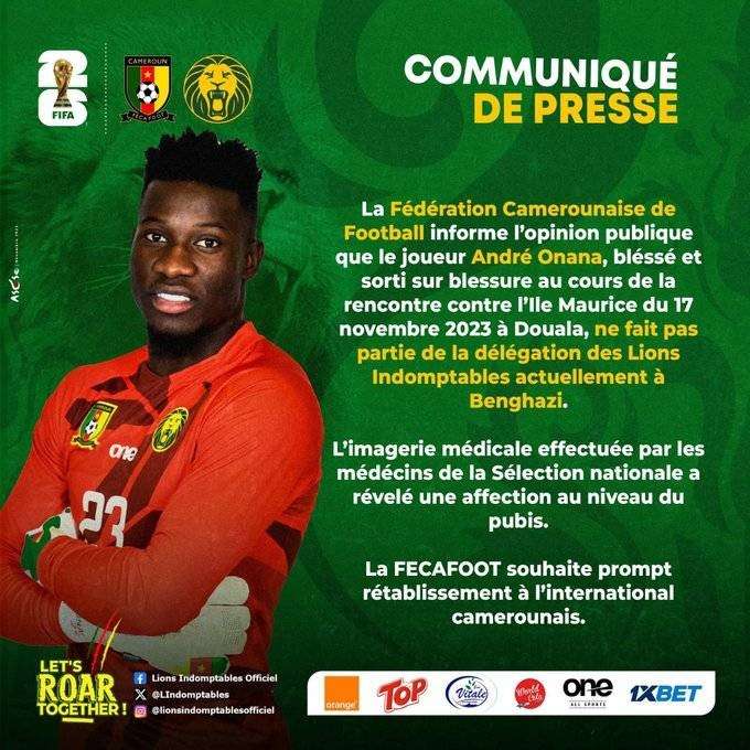 喀麦隆官方:曼联门将奥纳纳因伤退出国家队