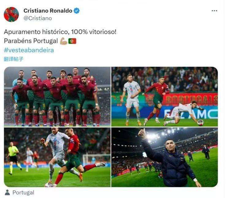 C罗更新个人社媒庆祝球队晋级:历史性的晋级 100%的胜率 恭喜