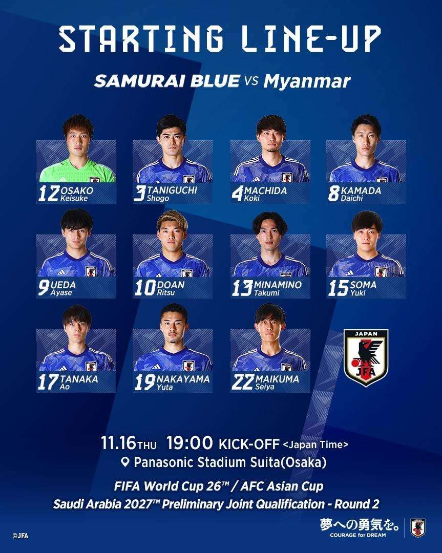 日本vs缅甸首发:镰田大地先发 南野拓实、上田绮世出战