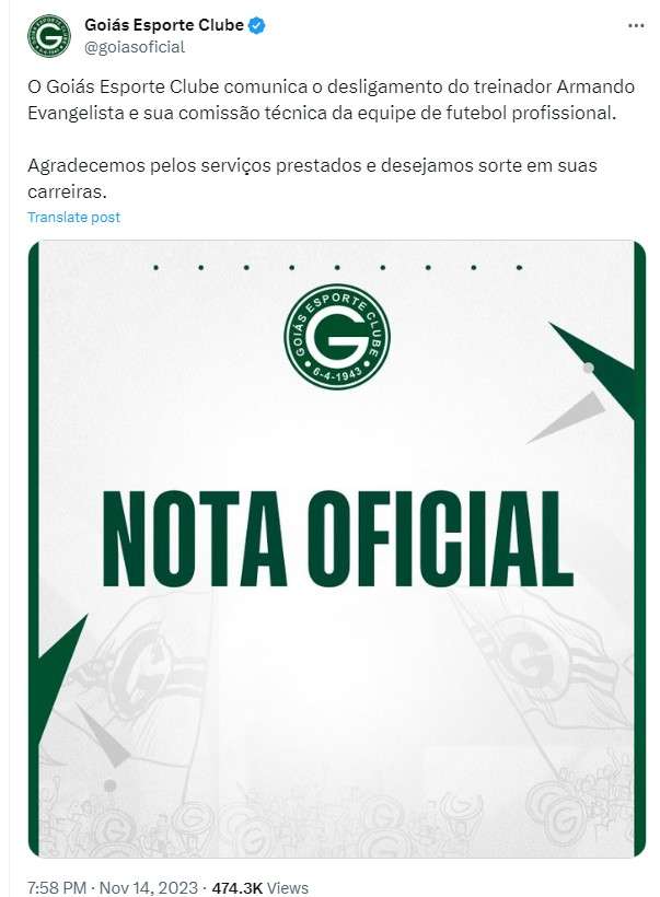 官方:戈亚斯主帅埃万杰利斯塔下课 球队目前排名巴甲倒数第3
