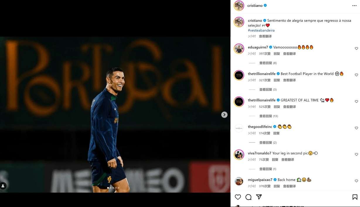 C罗重返国家队心情大好 个人社媒晒照发文:每次回到国家队都很开心