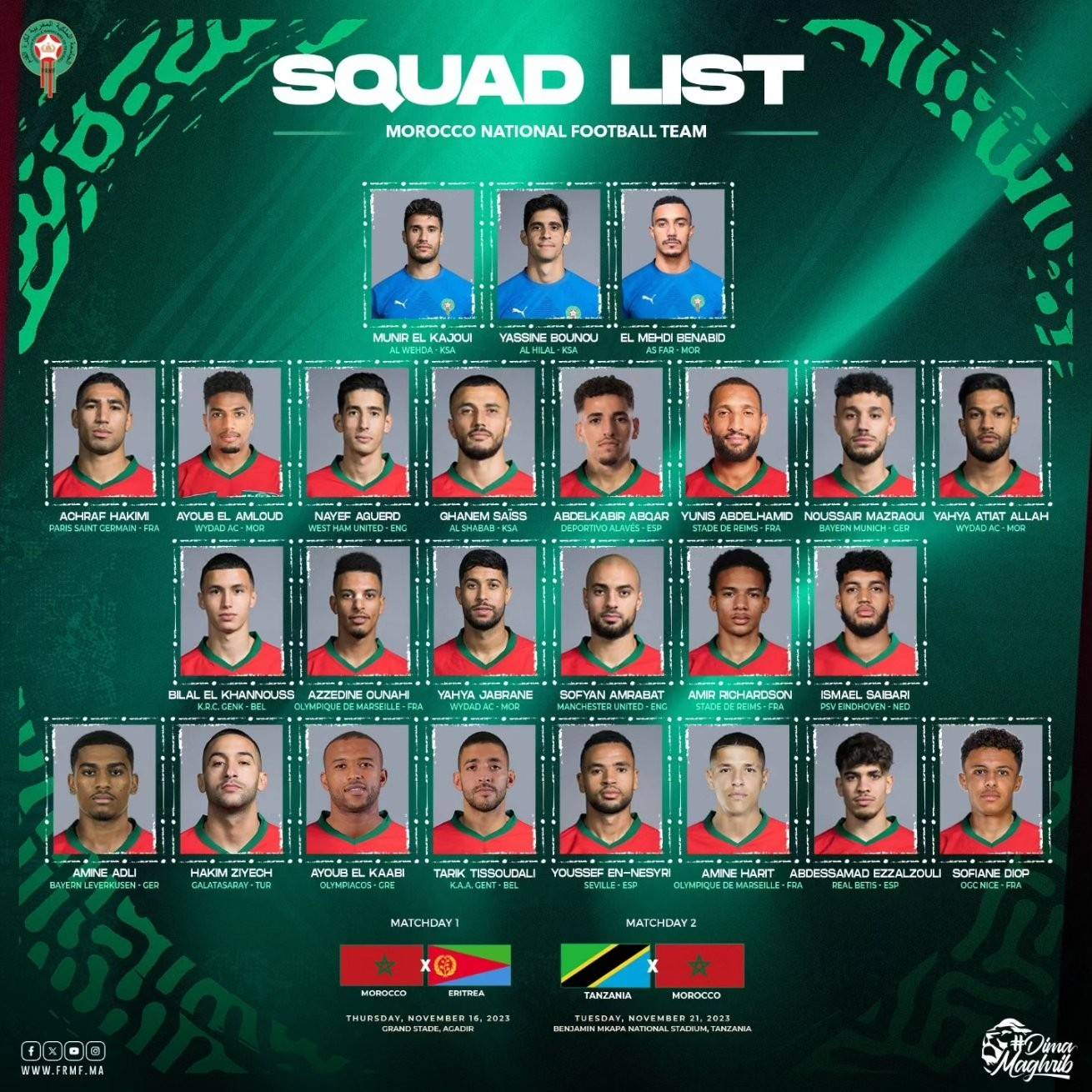 摩洛哥最新大名单:齐耶赫、布努、阿什拉夫等重要球员悉数入选