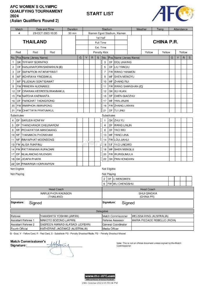 中国女足vs泰国首发:王珊珊领衔 张睿、张琳艳先发出战