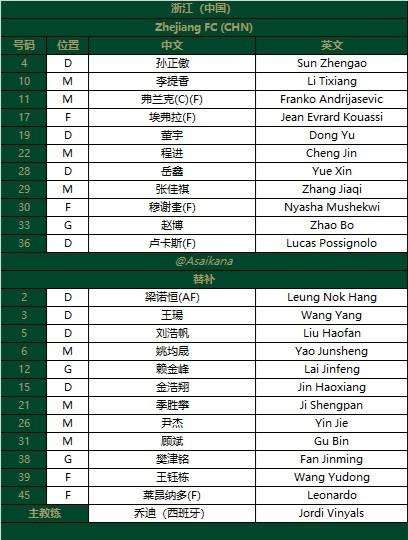 浙江队VS甲府风林首发:穆谢奎埃弗拉领衔四外援出战