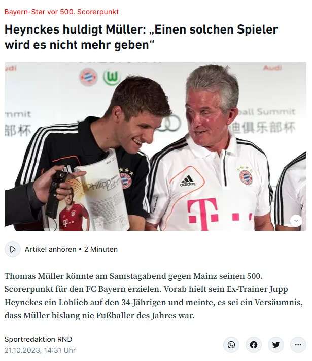 海因克斯:托马斯-穆勒是不世出的奇才!就像贝肯鲍尔和盖德-穆勒那