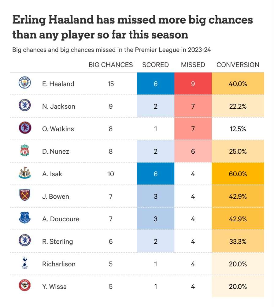 TA:不怪队友不传球 哈兰德本季英超黄金机会转化率不足五成