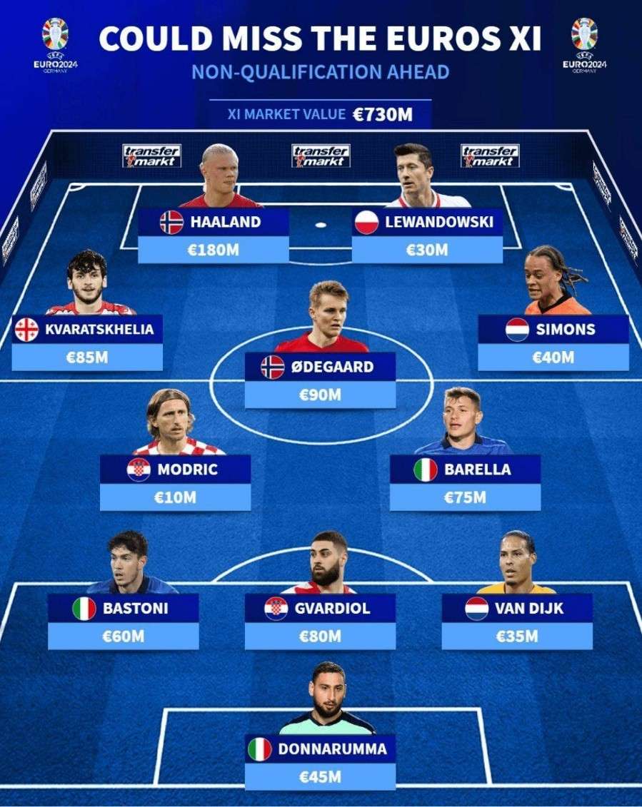 德转列可能错过欧洲杯最佳阵容:哈兰德、莫德里奇领衔 莱万、范戴克