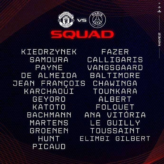 巴黎女足vs曼联女足欧冠大名单公布:卡托托领衔豪华锋线