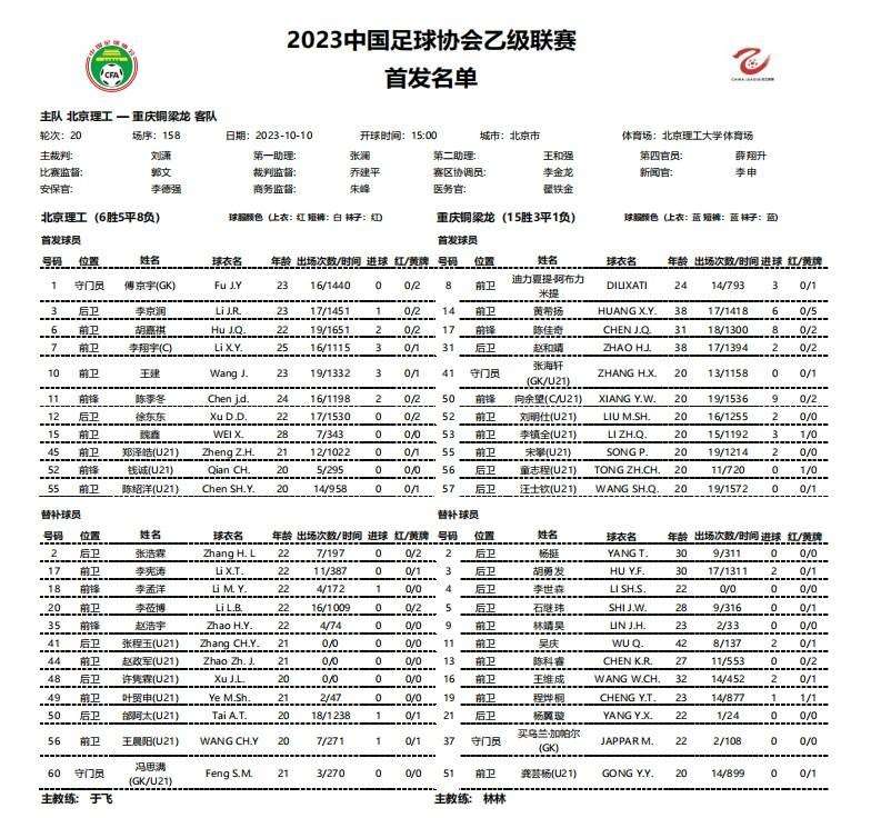 北京理工vs重庆铜梁龙首发:向余望领衔 黄希扬出战