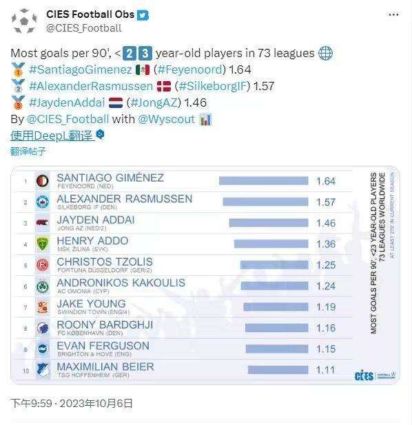 全球73个联赛U23球员90分钟效率榜:费耶诺德妖星吉梅内斯高达