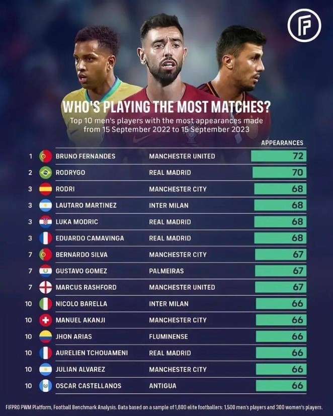 铁人!B费是过去一年中出场最多的男足球员 第二是罗德里戈