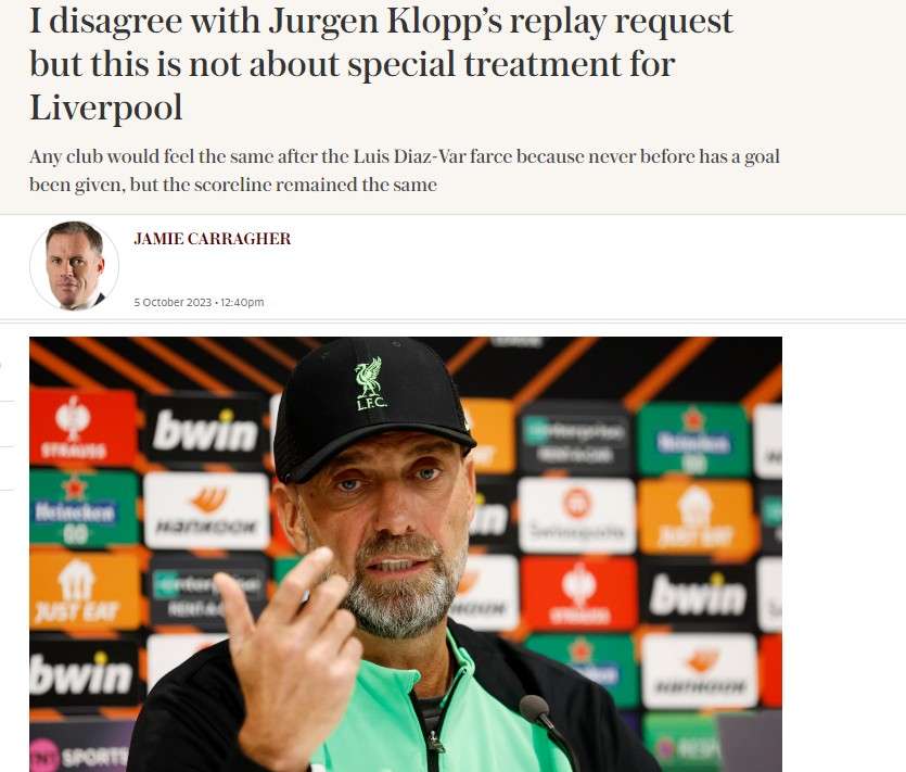 卡拉格:我不同意克洛普的重赛提议 英超不会让误判即重赛的情况出现