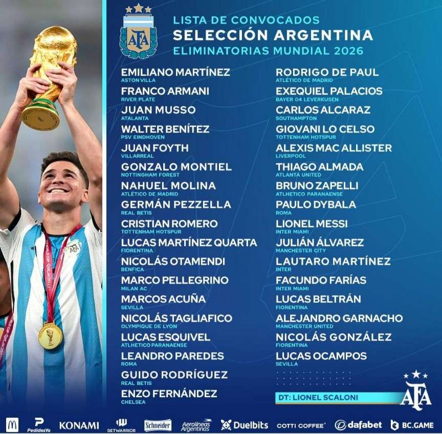 阿根廷国家队大名单:梅西领衔 劳塔罗、阿尔瓦雷斯在列