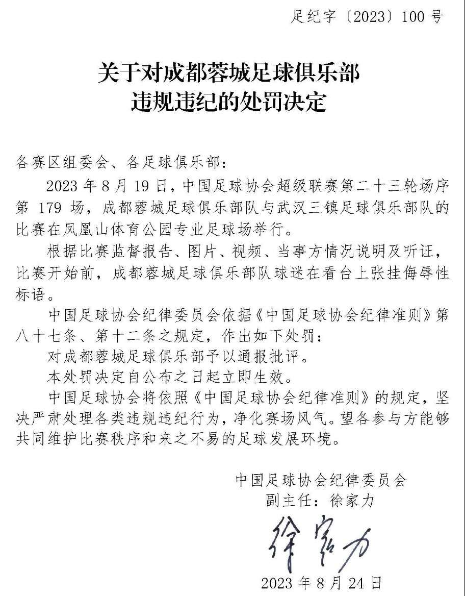 足协官方:成都蓉城主场张挂侮辱性标语 被通报批评+罚款2万