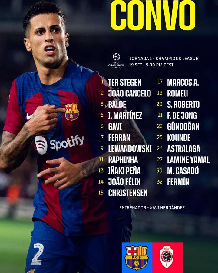巴萨公布战安特卫普大名单:莱万领衔 坎塞洛、京多安在列