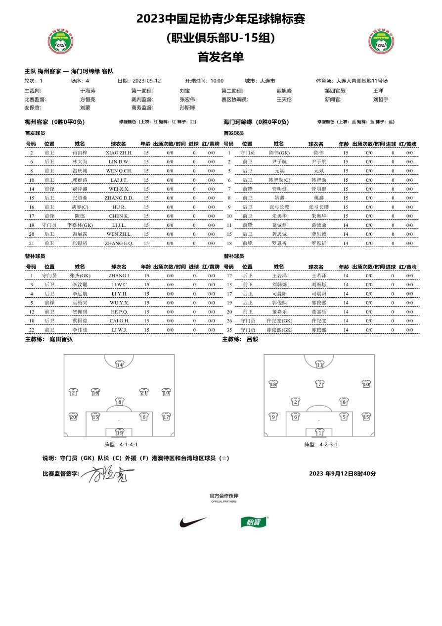 U15联赛第一轮 梅州客家vs海门珂缔缘首发阵容公布