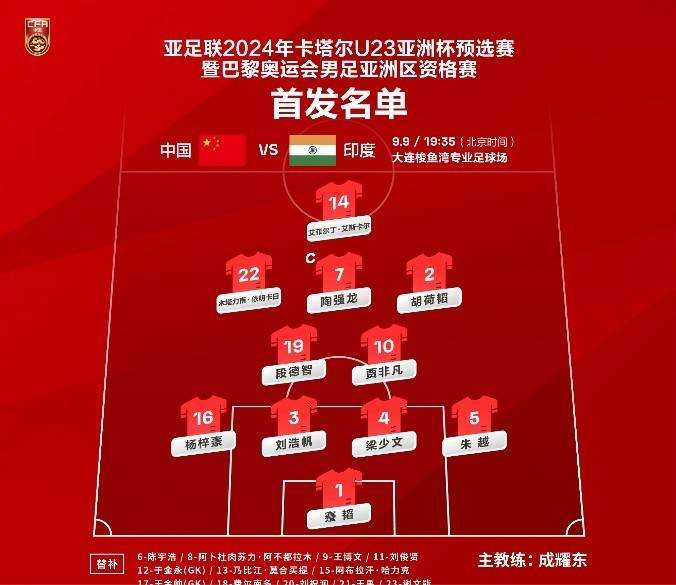 中国国奥vs印度首发:陶强龙、艾菲尔丁领衔 段德智在列