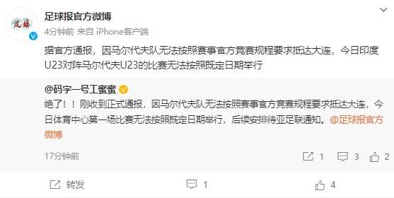 足球报:因马尔代夫U23无法按时抵达大连 与印度的奥预选赛或将改