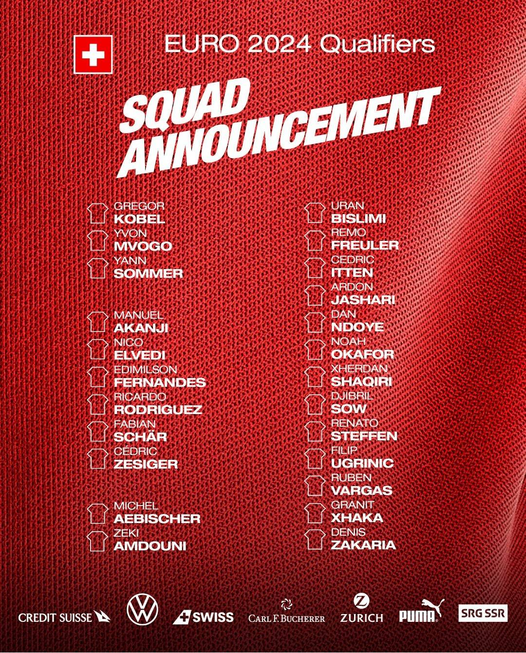 瑞士最新一期大名单:扎卡、沙奇里、阿坎吉入选 扎卡里亚、索默在列