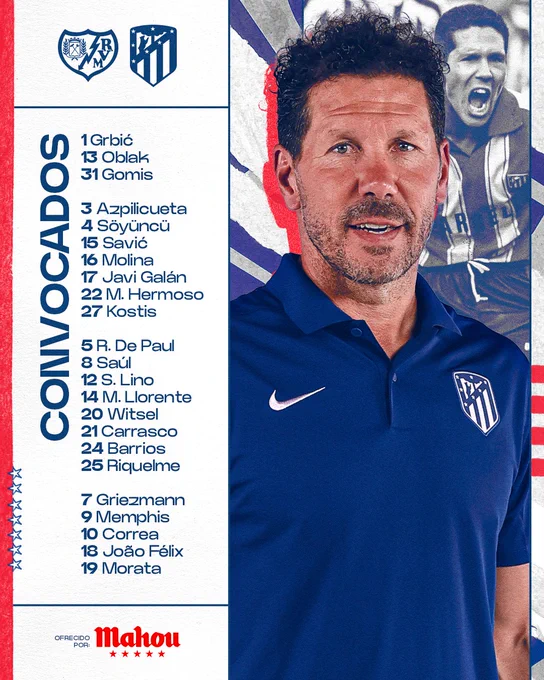 马竞公布对阵巴列卡诺大名单:菲利克斯回归