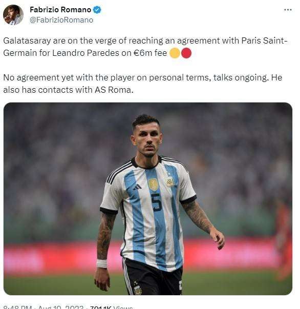 罗马诺:加拉塔萨雷与大巴黎达成协议 600万欧收购莱昂德罗·帕雷