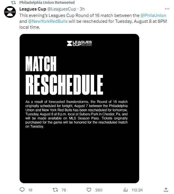 官方:费城联合VS纽约红牛的比赛因天气原因推迟至8月9日8:00