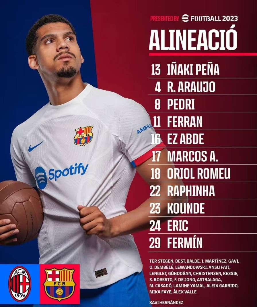 巴萨vs米兰首发:莱万、京多安替补 孔德、佩德里先发出战
