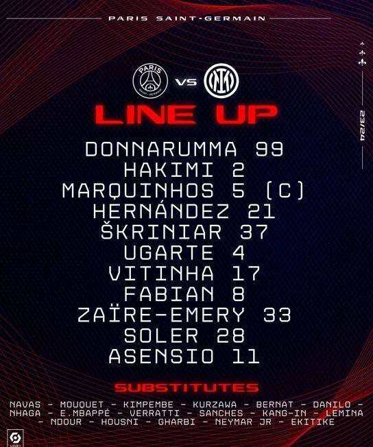 巴黎vs国米首发:阿森西奥领衔 内马尔替补
