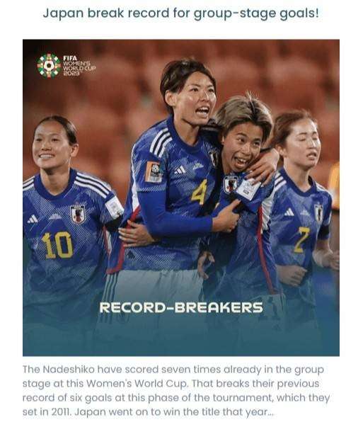 日本女足已打破自己2011年世界杯夺冠时的小组赛进球纪录
