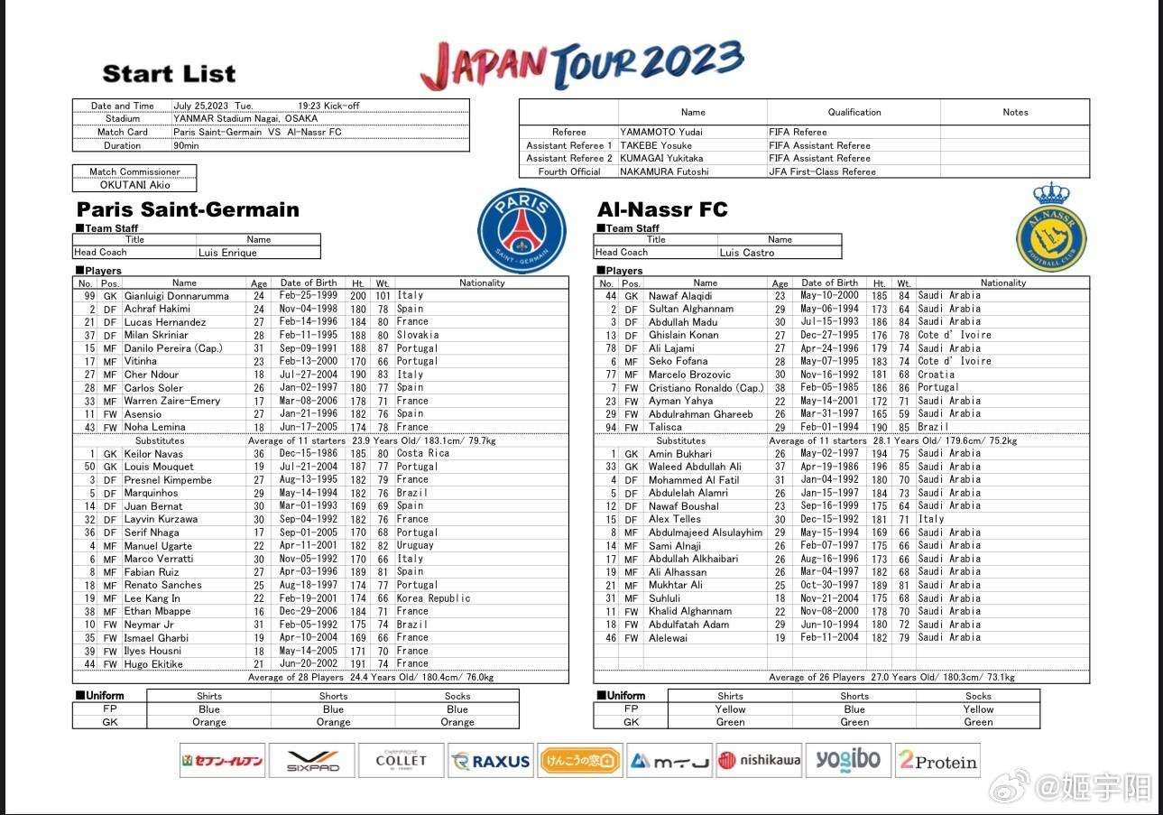 巴黎圣日耳曼vs利雅得胜利首发:C罗先发出战 内马尔替补待命