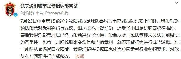 官方来了!辽宁沈阳城市回应主帅段鑫掌掴事件