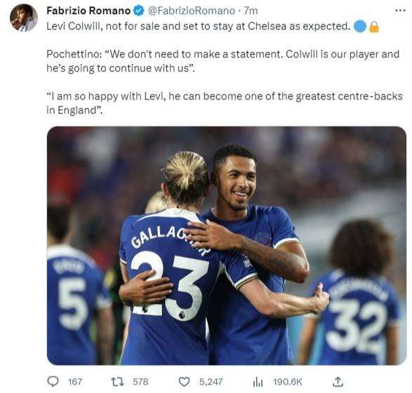 罗马诺:切尔西球员里维·科尔维尔确定留队