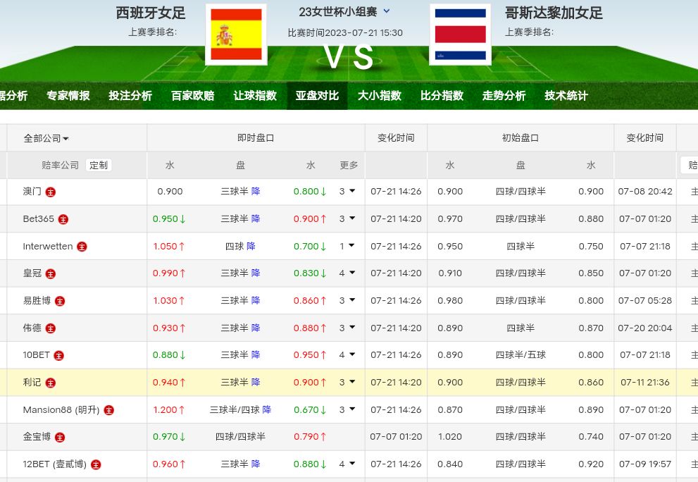 女足初盘没有一个上盘,没有一场大球,西班牙27分钟停赛,后面70