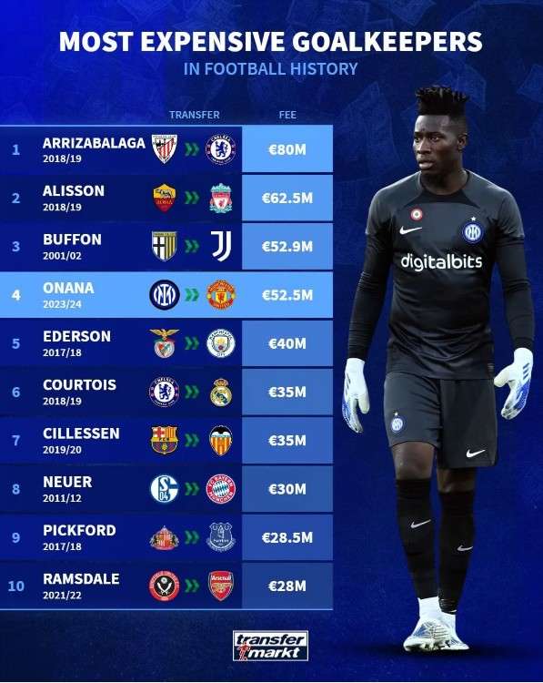 德转盘点门将转会费历史纪录:奥纳纳仅排第4 凯帕8000万欧居首