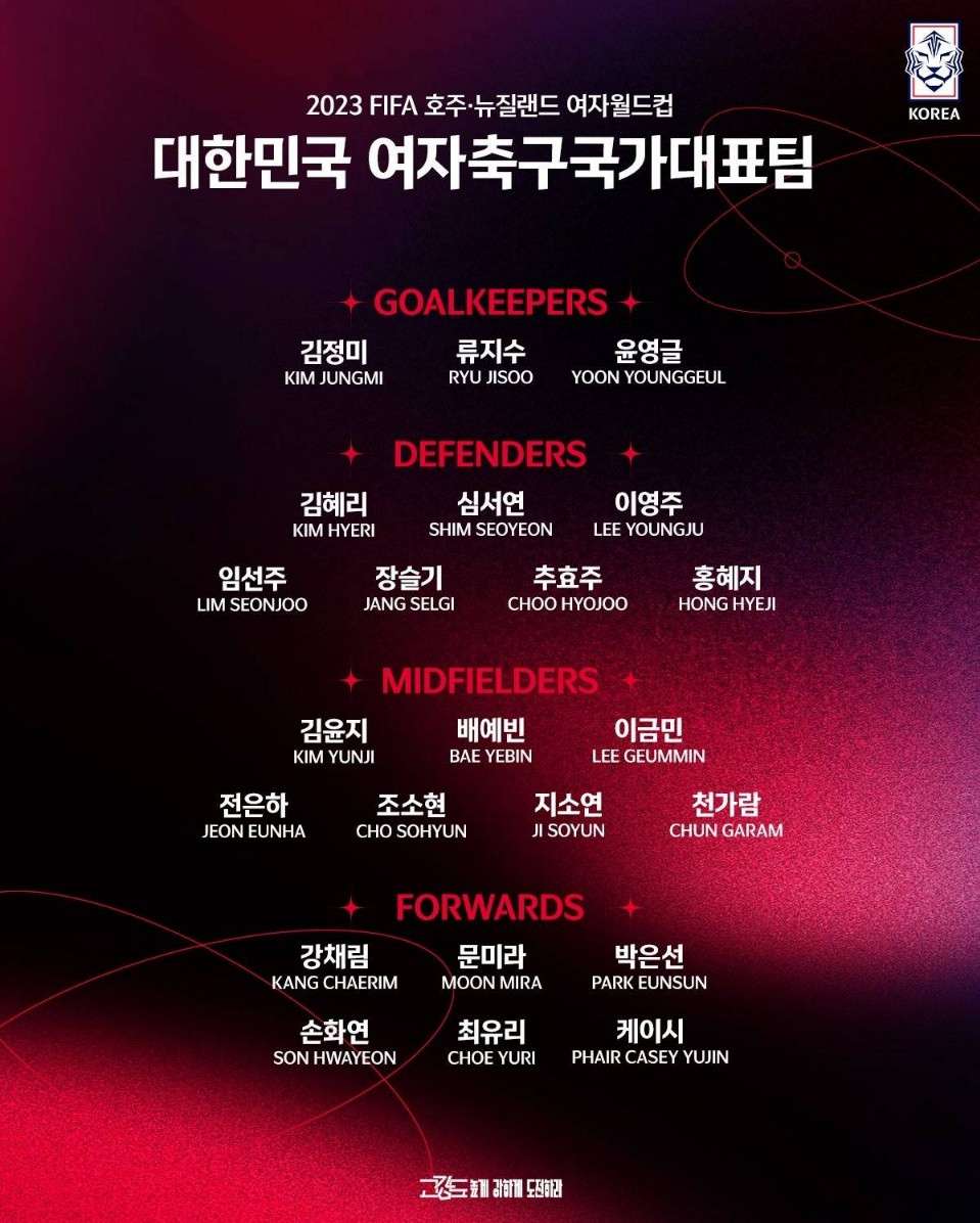 韩国女足世界杯大名单:池笑然领衔 崔宥莉、姜綵林在列