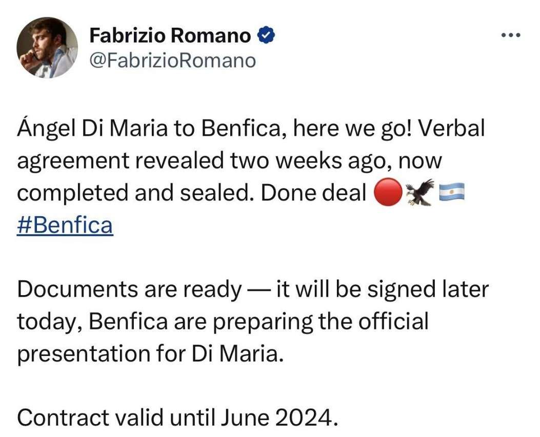 罗马诺:迪马利亚已飞往本菲卡 双方合同将于今日签署