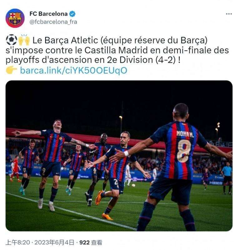 西协甲升级附加赛半决赛:巴萨B队首回合4-2击败卡斯蒂亚
